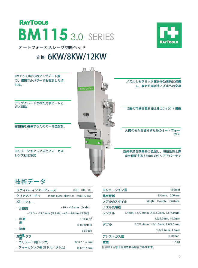 BM115E-3.0 オート フォーカスレーザ切断ヘッド(定格:6kW/8kW/12kW)